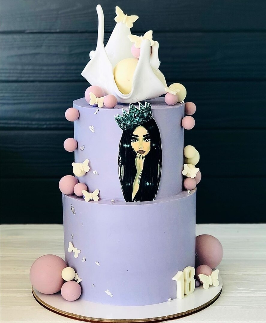 Двухъярусный лиловый тортик на совершеннолетие понравится всей большой компании дружных гостей